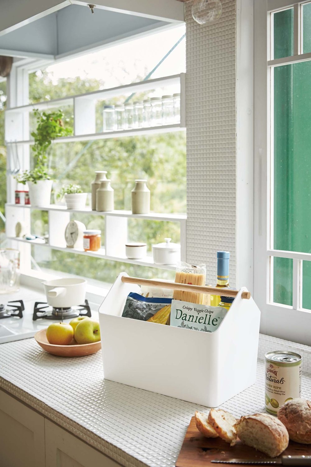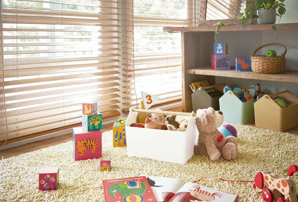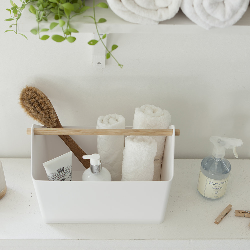 Esta caja de almacenamiento se puede utilizar para guardar juguetes, libros ilustrados, muñecas o cualquier otro artículo de la casa. El mango de madera agrega un acento elegante.
