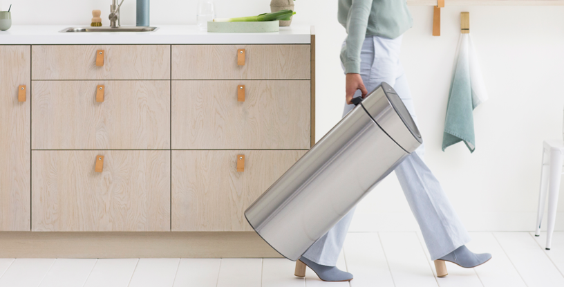 El cubo Touch Bin de Brabantia de 23+10 litros incluye dos cubos, pero solo ocupa el espacio de uno. Su mecanismo de abertura suave hace que la tapa se abra fácilmente con un simple toque de la mano. Cuenta con dos cubos interiores extraíbles, se puede colocar pegado a la pared, dispone de un aro protector y es higiénico gracias a su gran abertura.