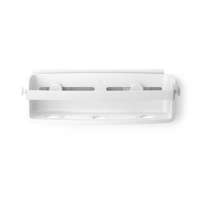 El contenedor de adhesivos flexible permite almacenar botellas de champú y jabón volteadas para que pueda maximizar la cantidad de producto que puede usar.