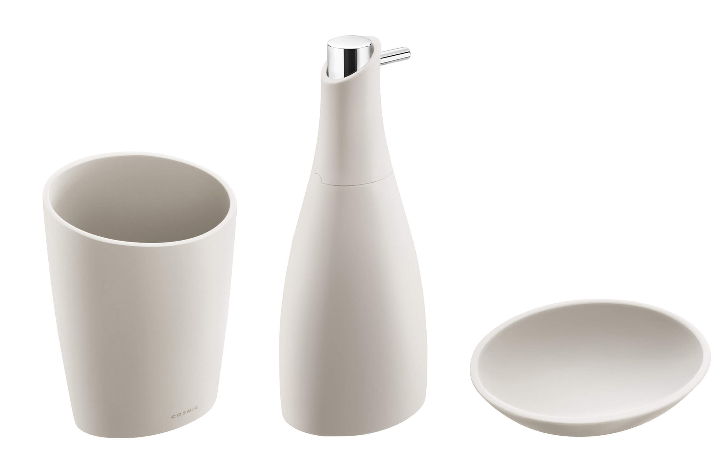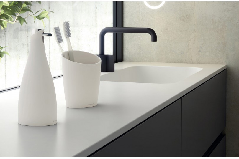 Accesorios de baño fabricados en PMMA (polimetilmetacrilato), un material muy resistente a los impactos y a los rayos UVA, manteniéndolos inalterables en el tiempo. Recubiertos de una pintura gomosa de color piedra soft que le aporta un tacto sedoso.