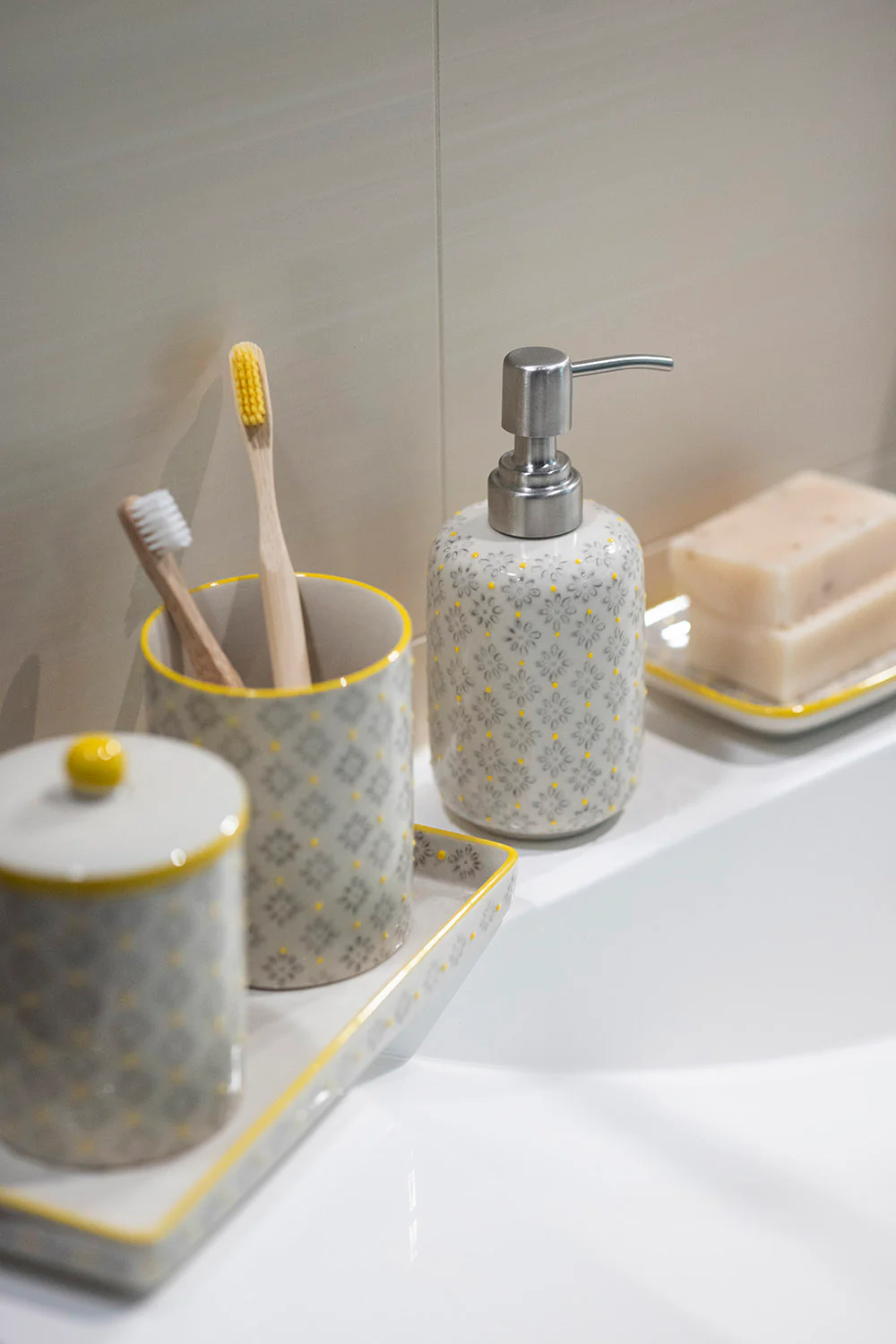 La cuidadosa combinación de estos accesorios garantiza no solo un uso práctico, sino también una composición general estéticamente agradable. Sumérjase en un mundo de elegancia y funcionalidad: descubra cómo nuestros accesorios de baño aportan belleza atemporal a su baño. Dimensiones: 7,5 x 7,5 x 17 cm. Material: Gres.