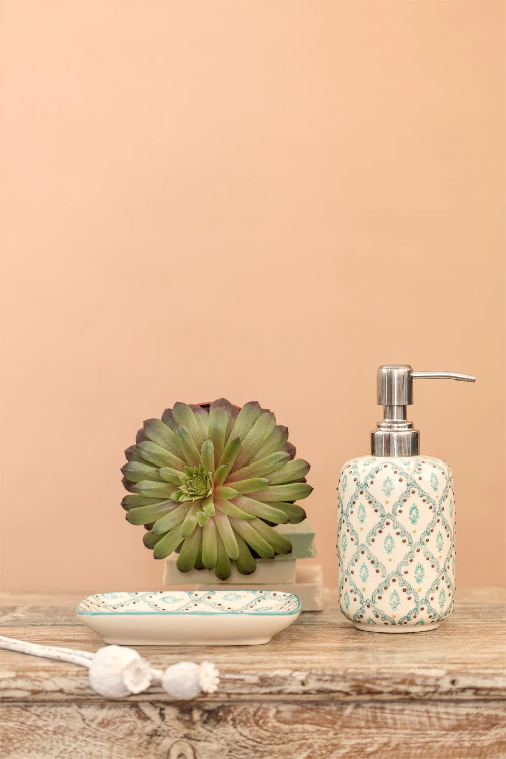 ¿Es tu baño tu pequeño santuario personal de bienestar? Entonces debería irradiar una sensación de bienestar hasta el último detalle. Esta jabonera te encantará con su intrincado diseño. Su estampado retro convierte a este accesorio de baño en un verdadero punto de atracción. Cada pieza es única y tiene su propio toque personal, ya que los estampados se aplican a mano. La jabonera tiene forma rectangular con esquinas redondeadas y orificios de drenaje de eficacia comprobada, que garantizan que el jabón siempre se mantenga seco.
