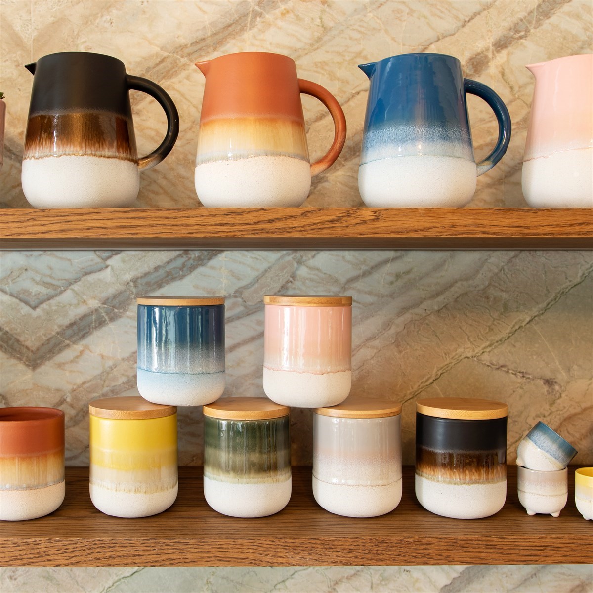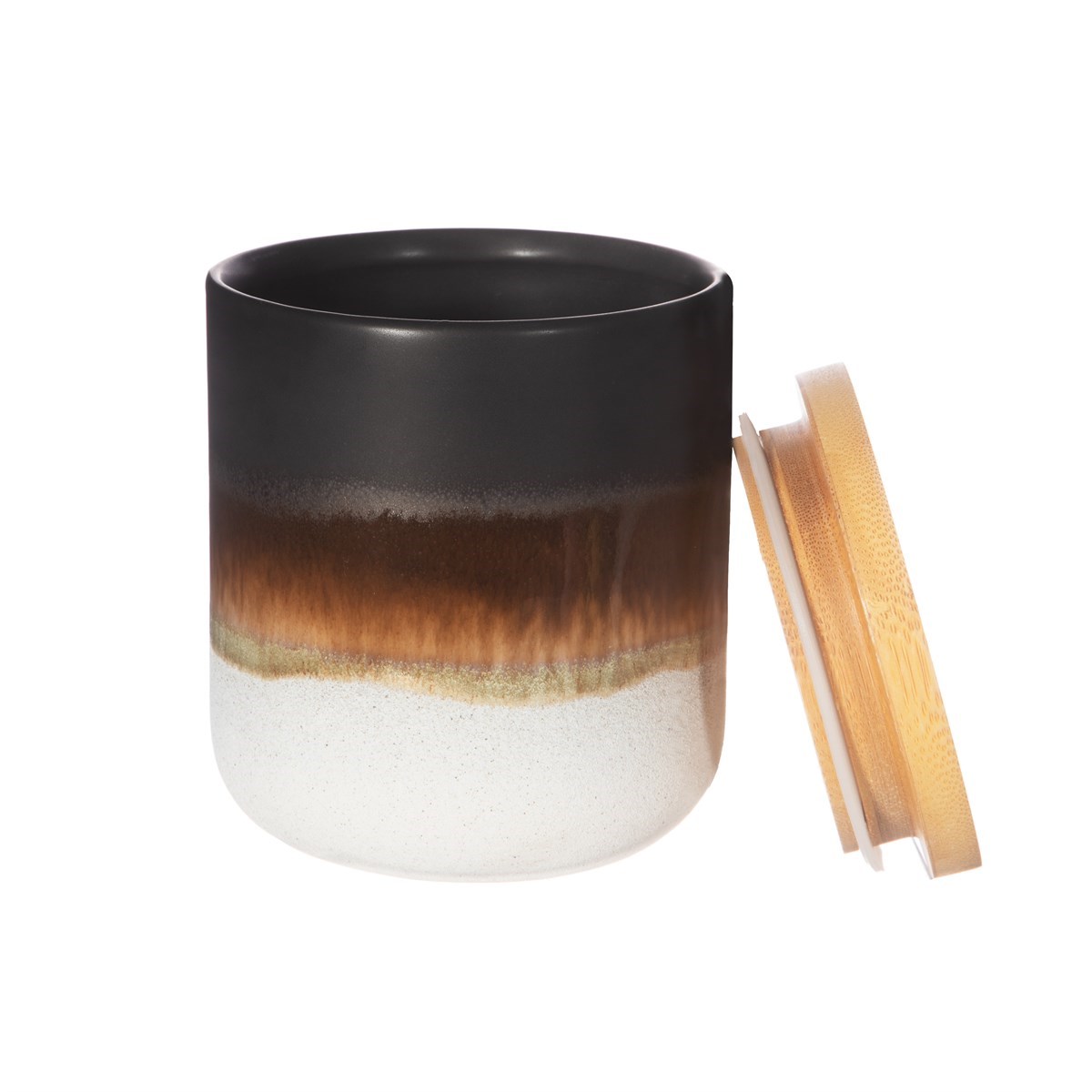 Agregue un toque de espíritu bohemio a su colección botánica. Parte de nuestra colección Mojave Glaze que se encuentra dentro de nuestra amplia gama de almacenamiento de cocina al por mayor. Diseñado con un acabado negro mate, creado a partir de una técnica de esmalte reactivo que forma sutiles variaciones en los tonos de color, haciendo que cada uno sea único y hermoso. Completo con una tapa de bambú y un sello seguro. Perfecto para guardar café, bolsitas de té o galletas.