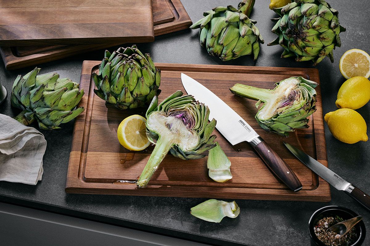 El clásico indispensable. Nuestro cuchillo de chef ENNO es una obra maestra del trabajo de precisión de Solingen y garantiza un trabajo preciso y sin concesiones en cualquier cocina. Desarrollado para profesionales y cocineros aficionados ambiciosos, equipado con una hoja especialmente rectificada del mejor acero de Solingen y un mango finamente equilibrado de madera noble de nogal. El cuchillo de chef ENNO es el compañero perfecto, ya sea para verduras, frutas, carne o pescado, su hoja afilada garantiza resultados excepcionales.