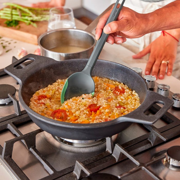 Diseñada para que dure mucho más tiempo, esta cuchara de cocina es resistente a altas temperaturas de la punta al mango. Fabricada en Silicona Platino, un material que resiste temperaturas de hasta 220ºC, para reforzar las zonas con mayor contacto con el calor y mayor desgaste. El PBT es un material rígido e higiénico, que resiste hasta 180ºC para que el utensilio pueda reposar sobre superficies calientes como los bordes de las ollas, mientras estás cocinando. Apto para lavavajillas.