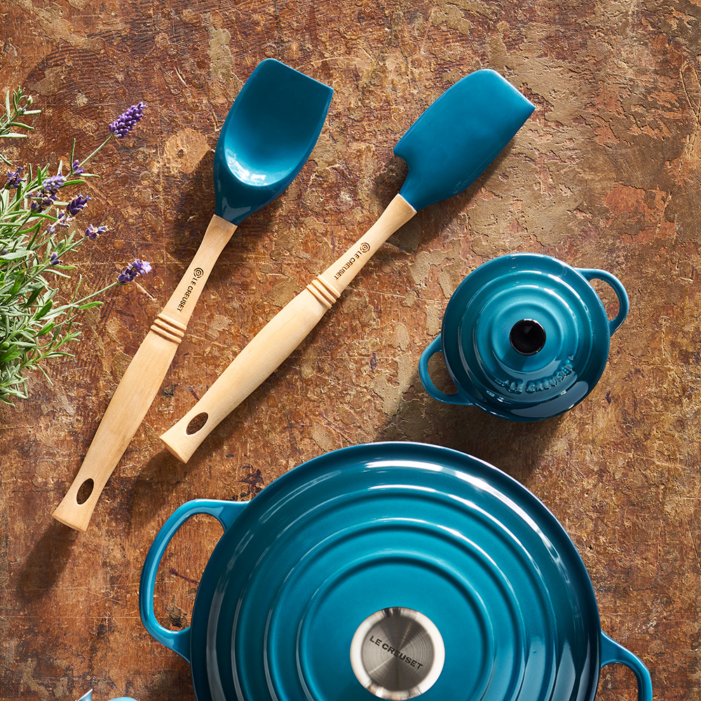Las espátulas son lo suficientemente resistentes como para soportar años de uso diario. El cabezal de silicona no absorbe los colores, ni los sabores ni los olores de los alimentos. Disponible en una variedad de formatos y colores para complementar sus utensilios de cocina de Le Creuset.
