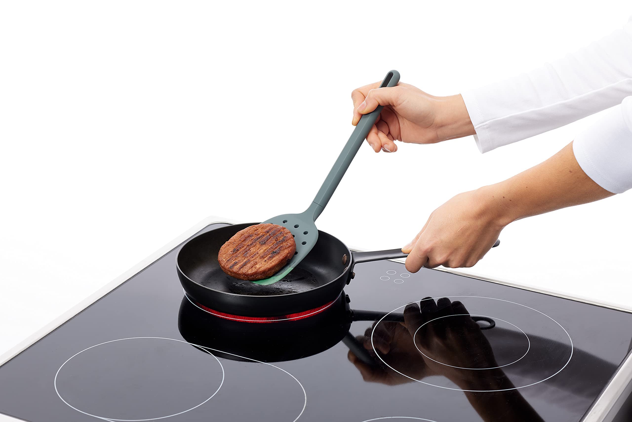 El utensilio indispensable para los amantes del vuelta y vuelta. Esta espátula de cocina tiene la inclinación y forma ideal para levantar, voltear y servir filetes grandes de carne o pescado, hamburguesas o verduras sin que se rompan.