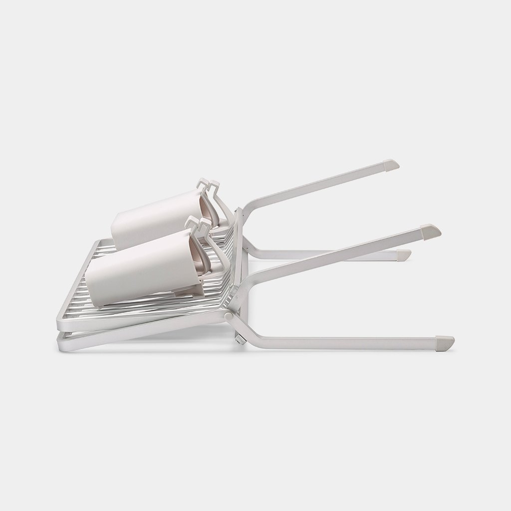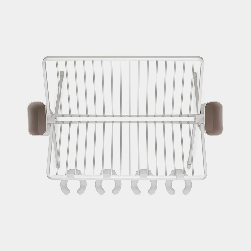 Este escurreplatos plegable con bandeja de cuenta con un amplio espacio para platos, cazos, sartenes y vasos, además de para esas delicadas copas de vino. Los recipientes para cubiertos y utensilios son extraíbles, lo que hace más fácil plegar el escurreplatos y guardarlo. Un escurreplatos realmente ingenioso, tan bonito que puedes dejarlo de forma permanente en tu cocina, pero también puedes guardarlo sin que ocupe apenas espacio.