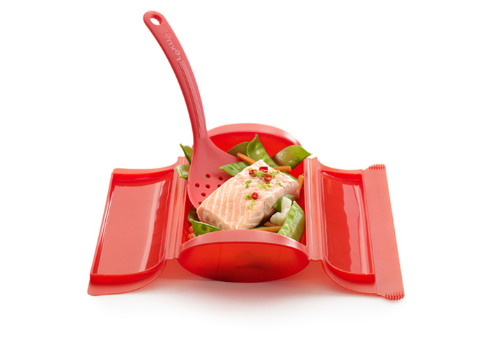 CONSEGUIRÁS DE MANERA SENCILLA Y LIMPIA PREPARACIONES COMPLETAS AL VAPOR, ¡EN POCOS MINUTOS! TODO TIPO DE VEGETALES, PESCADO, MARISCO... ¡PERFECTO PARA COCINAR 1 O 2 RACIONES! EN EL ESTUCHE DE VAPOR LOS ALIMENTOS SE COCINAN CON SU PROPIO JUGO, DE FORMA UNIFORME. EL PROPIO VAPOR DE AGUA AYUDA A QUE QUEDEN TIERNOS Y JUGOSOS. SE CONSIGUE EL LLAMADO EFECTO “PAPILLOTE”, QUE PRESERVA EL SABOR NATURAL DE LOS INGREDIENTES Y PRINCIPALES NUTRIENTES, COMO VITAMINAS Y MINERALES.