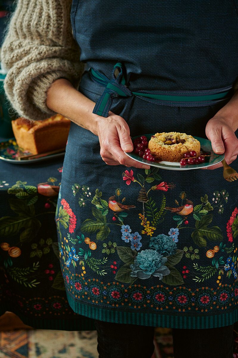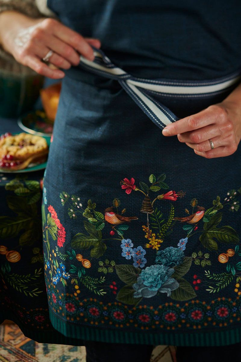Un accesorio muy útil para usar mientras cocinas, este delantal Winter Wonderland. El delantal está decorado con coloridas y exóticas flores, hojas, pájaros y ardillas. El delantal tiene un fondo azul oscuro y un cierre de corbata verde/azul. Eche un vistazo a los otros artículos de nuestra colección Winter Wonderland para obtener más inspiración y hermosas combinaciones.