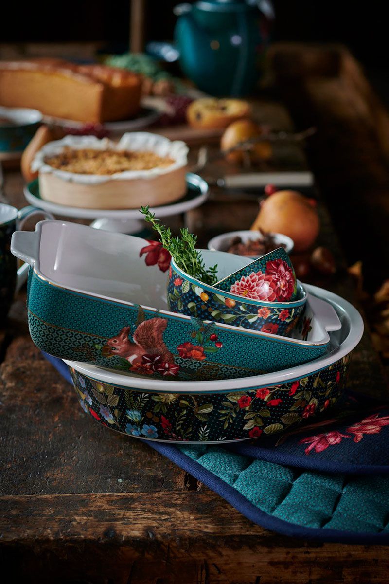 Un accesorio muy útil para usar mientras cocinas, esta manopla doble para horno Winter Wonderland. La manopla de horno está ricamente decorada con flores de colores exóticos, hojas, pájaros y frutos dorados. La manopla para horno tiene un fondo azul oscuro en la parte superior y un color verde/azul en el interior. Además, esta manopla para horno tiene un lazo para colgar, lo que le permite colgarla fácilmente en un gancho. Debido a que la manopla doble para horno es extra larga, es fácil sacar una fuente grande para hornear del horno.