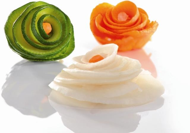 El cortador de espiral de GEFU siempre inspira a los artistas culinarios a proponer nuevas y deliciosas ideas de decoración. Con la herramienta de cocina, se pueden señalar diferentes verduras firmes, cortar en anillos o darles forma de floretes decorativos. De esta manera, zanahorias, rábanos y similares se convierten en un punto culminante en cada plato de verduras crudas y en una ensalada. La aplicación funciona tan fácilmente como con un sacapuntas.