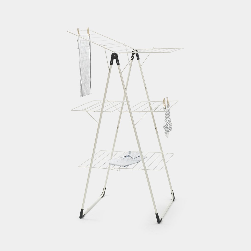 El tendedero tipo torre le ofrece 23 metros de espacio flexible para tender la colada y ocupa tan solo un metro cuadrado de su suelo. Puede con una carga completa de la lavadora e incluso con prendas pesadas como pantalones. No tiene más que desplegarlo y ajustar las alas: más sencillo imposible. Hasta puede tender prendas delicadas en horizontal en sus plataformas. La calidad en su máximo exponente.