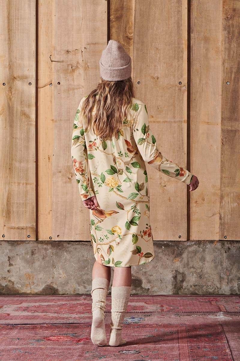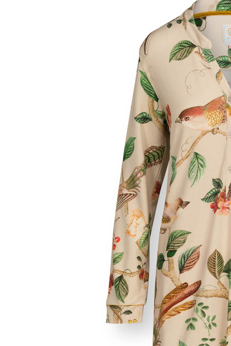 Este camisón color arena está decorado con el rico diseño Good Nightingale. El diseño floral repetido se compone de una variación de imaginativas flores y pájaros de chintz. El camisón contiene un escote de cuello pico con botones a tono.