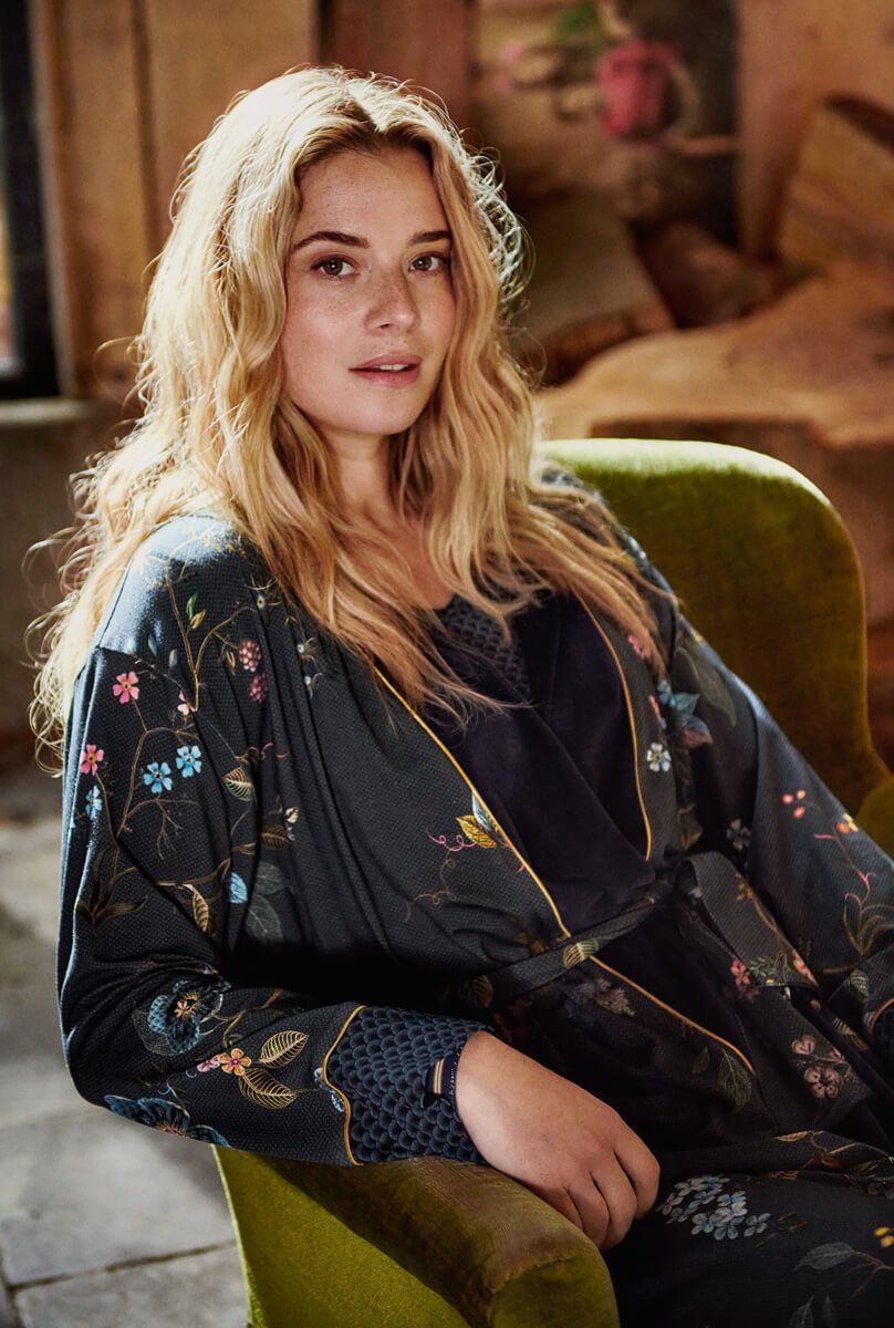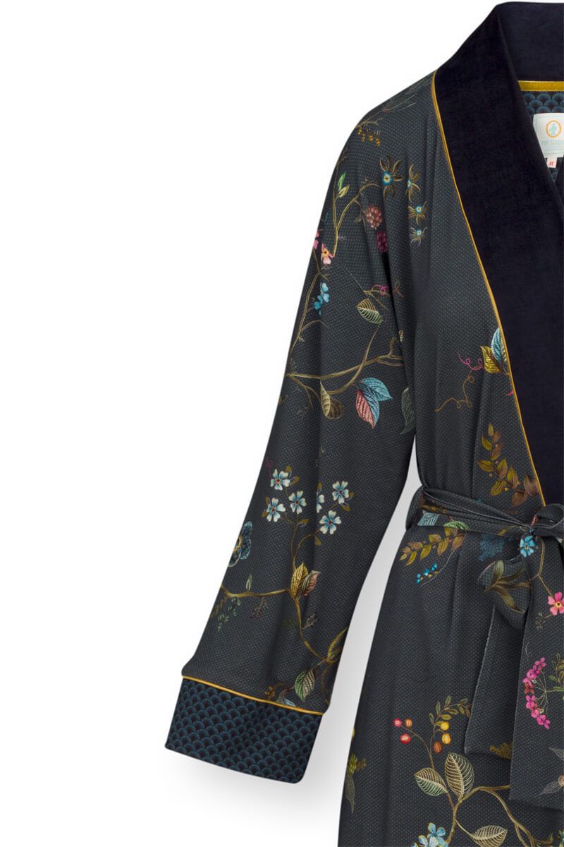 Este kimono en color azul oscuro está decorado con el elegante diseño floral de Kawai. El diseño floral repetido se compone de una variedad de ramas de flores y diferentes tipos de flores de fantasía. El kimono tiene un cinturón a juego y un borde de terciopelo.