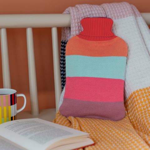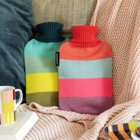 Cuando hace mucho frío afuera, una bolsa de agua caliente en el sofá o en la cama es realmente acogedora. Nuestras bolsas de agua caliente tienen una funda de punto suave y extraíble con rayas de colores y garantizan así un gran bienestar visual.