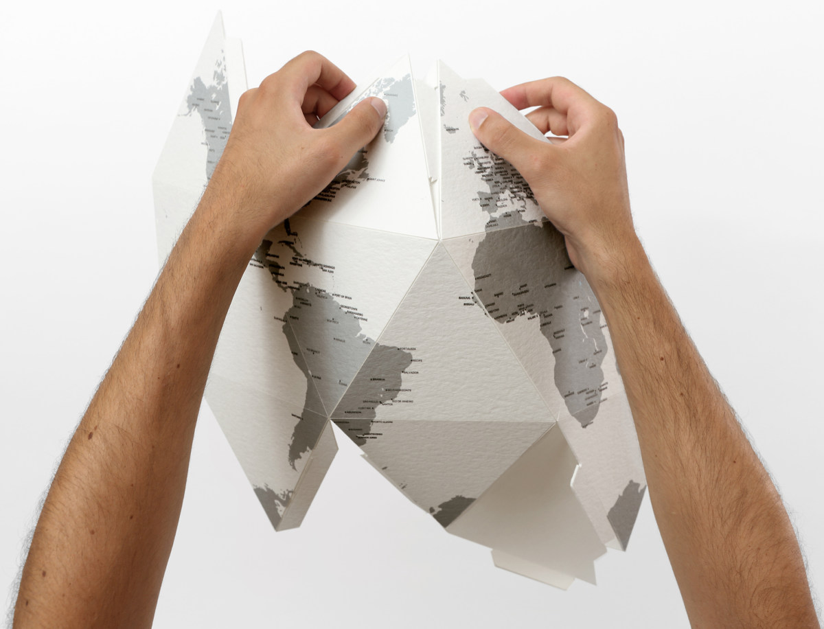 Al principio, Aquí parece bidimensional, como un atlas; en tan solo unos segundos se convierte en un globo tridimensional. Los gráficos realzan la preciosidad, la calidad táctil y la textura del papel. Aquí se erige solo, es muy ligero y se puede colocar en cualquier lugar, sobre una mesa o estantería, pero también en el suelo. Aquí está el mundo como debe ser: tan delicado como un poema, simple y sofisticado, transparente hasta el punto de que siempre podemos leer nuestras huellas en él.