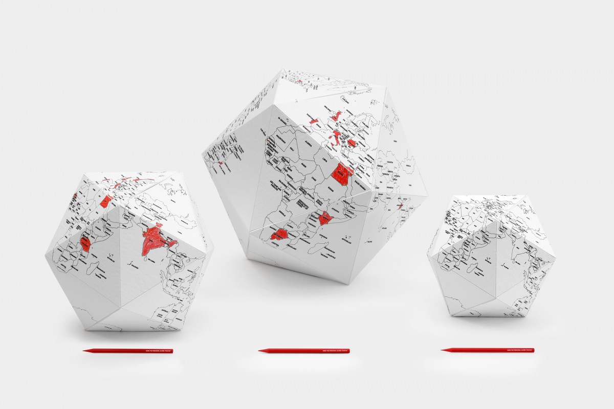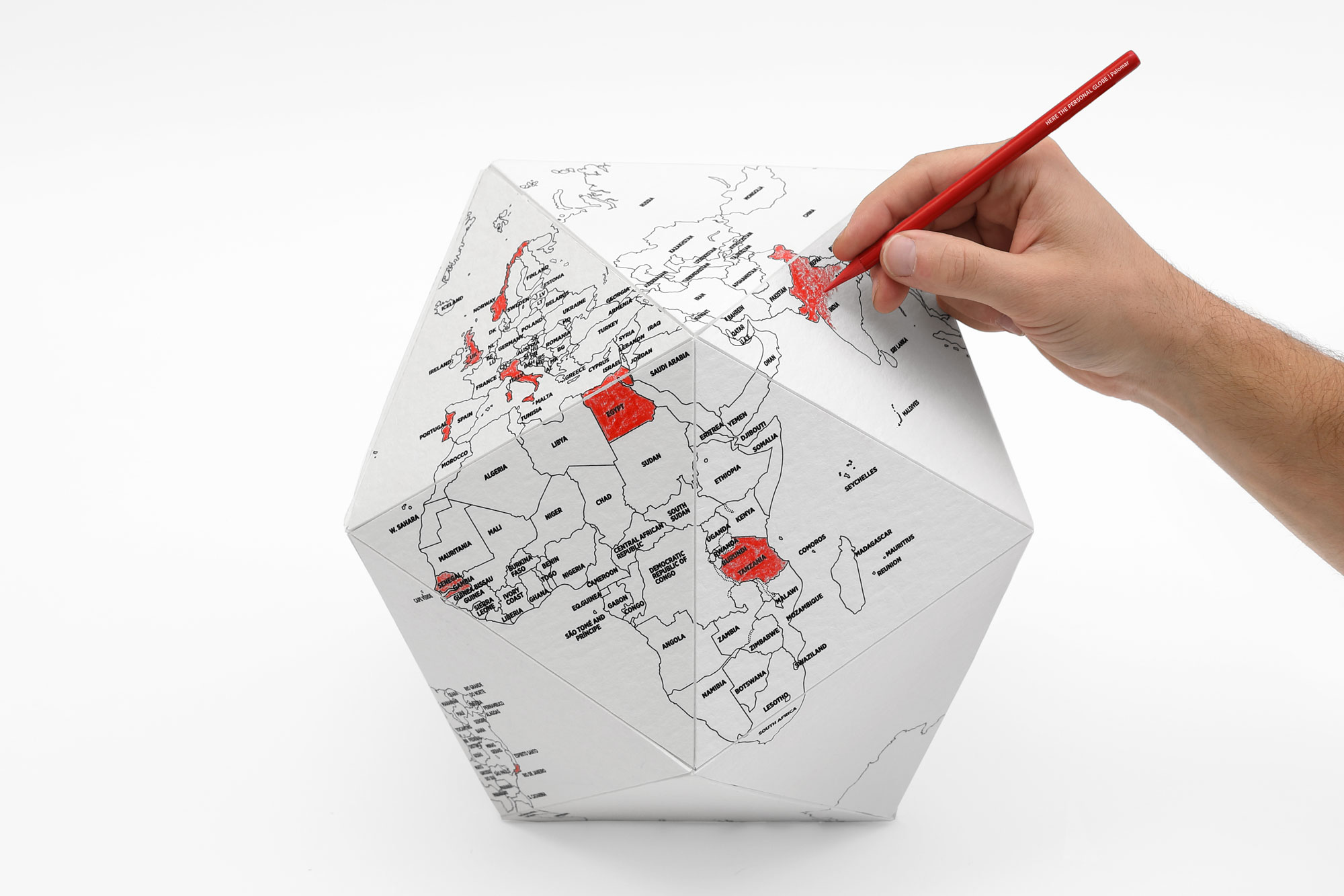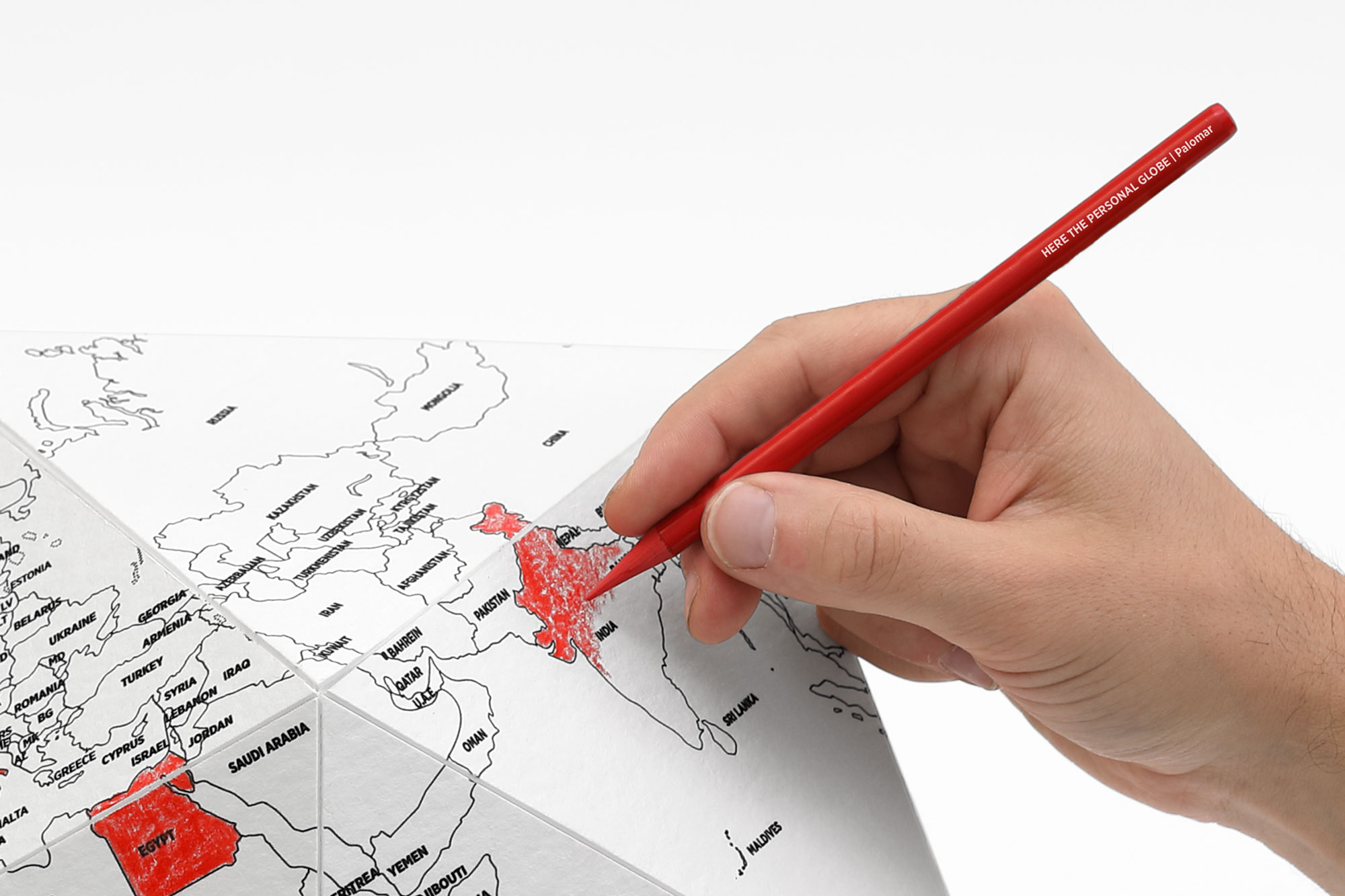 Al principio, Aquí parece bidimensional, como un atlas; en tan solo unos segundos se convierte en un globo tridimensional. Los gráficos realzan la preciosidad, la calidad táctil y la textura del papel. Aquí se erige solo, es muy ligero y se puede colocar en cualquier lugar, sobre una mesa o estantería, pero también en el suelo. Aquí está el mundo como debe ser: tan delicado como un poema, simple y sofisticado, transparente hasta el punto de que siempre podemos leer nuestras huellas en él.