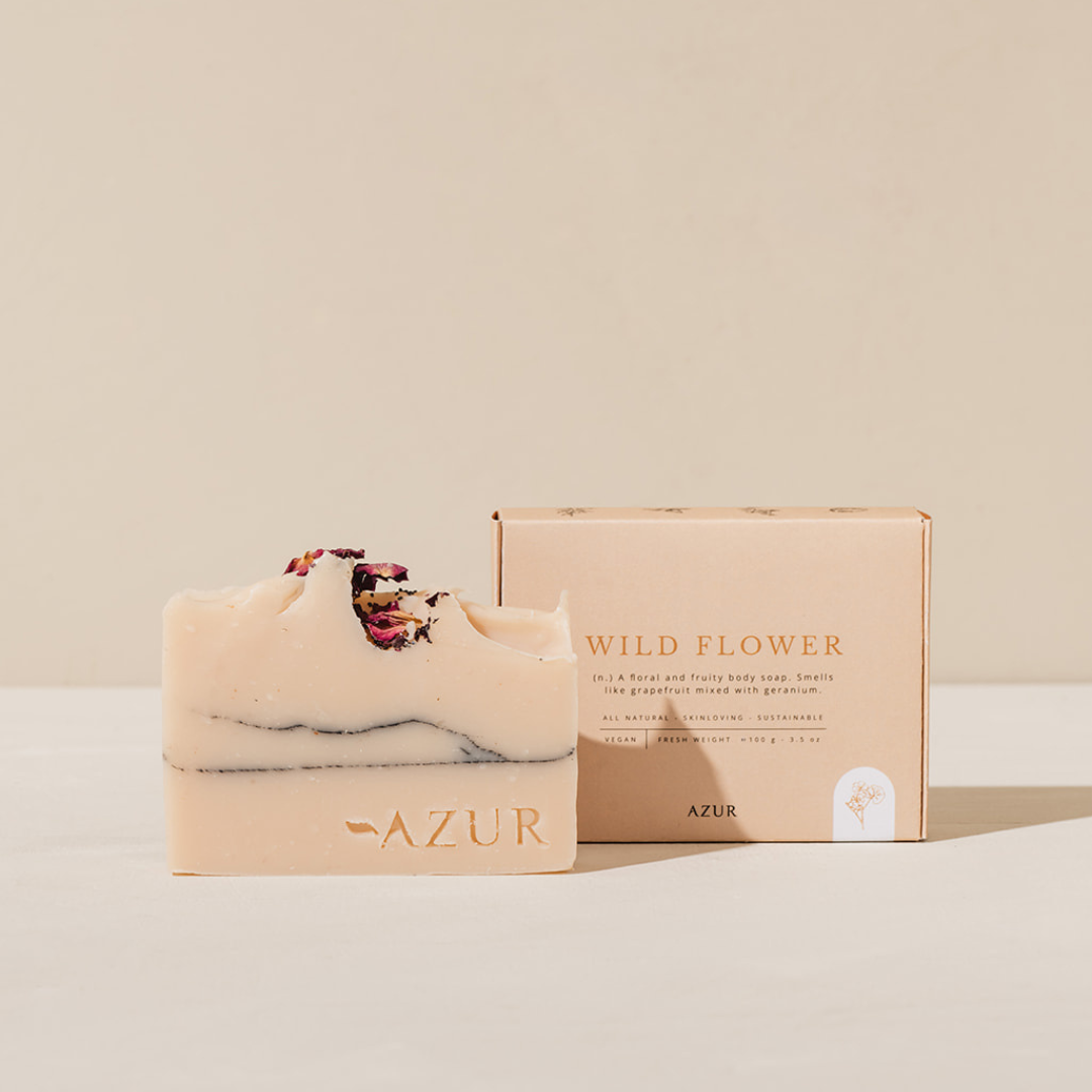 Barra corporal Wild Flower: con aromas de geranio y pomelo y un bonito color rosa por la arcilla rosa.