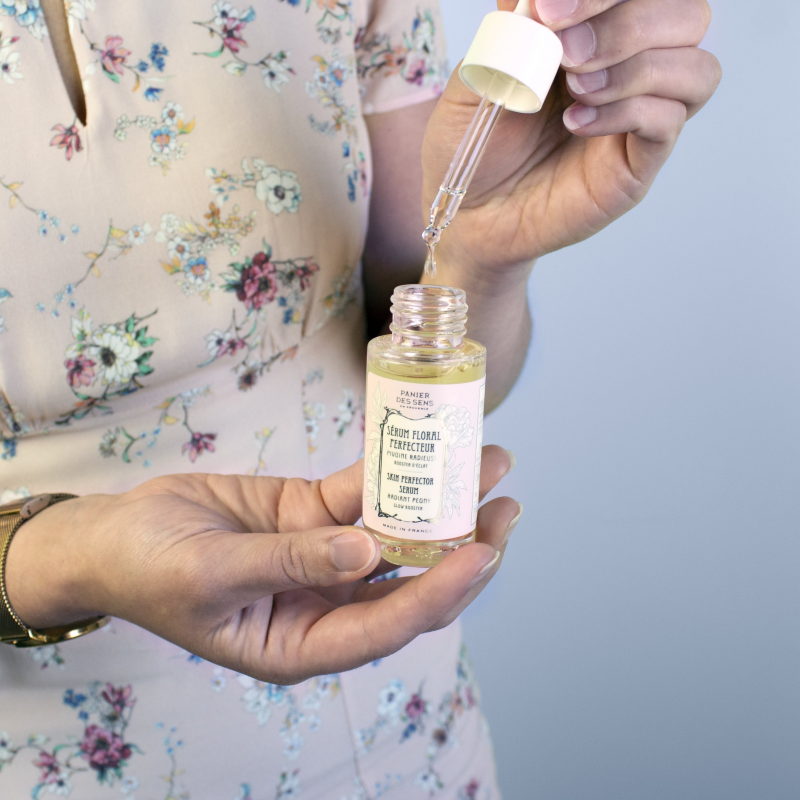 Aplique 2 gotas mañana y / o noche antes de su crema de cuidado. Masajear suavemente. Para agregar un toque extra de brillo a la piel, agregue una gota de suero floral a su crema en la palma de su mano.