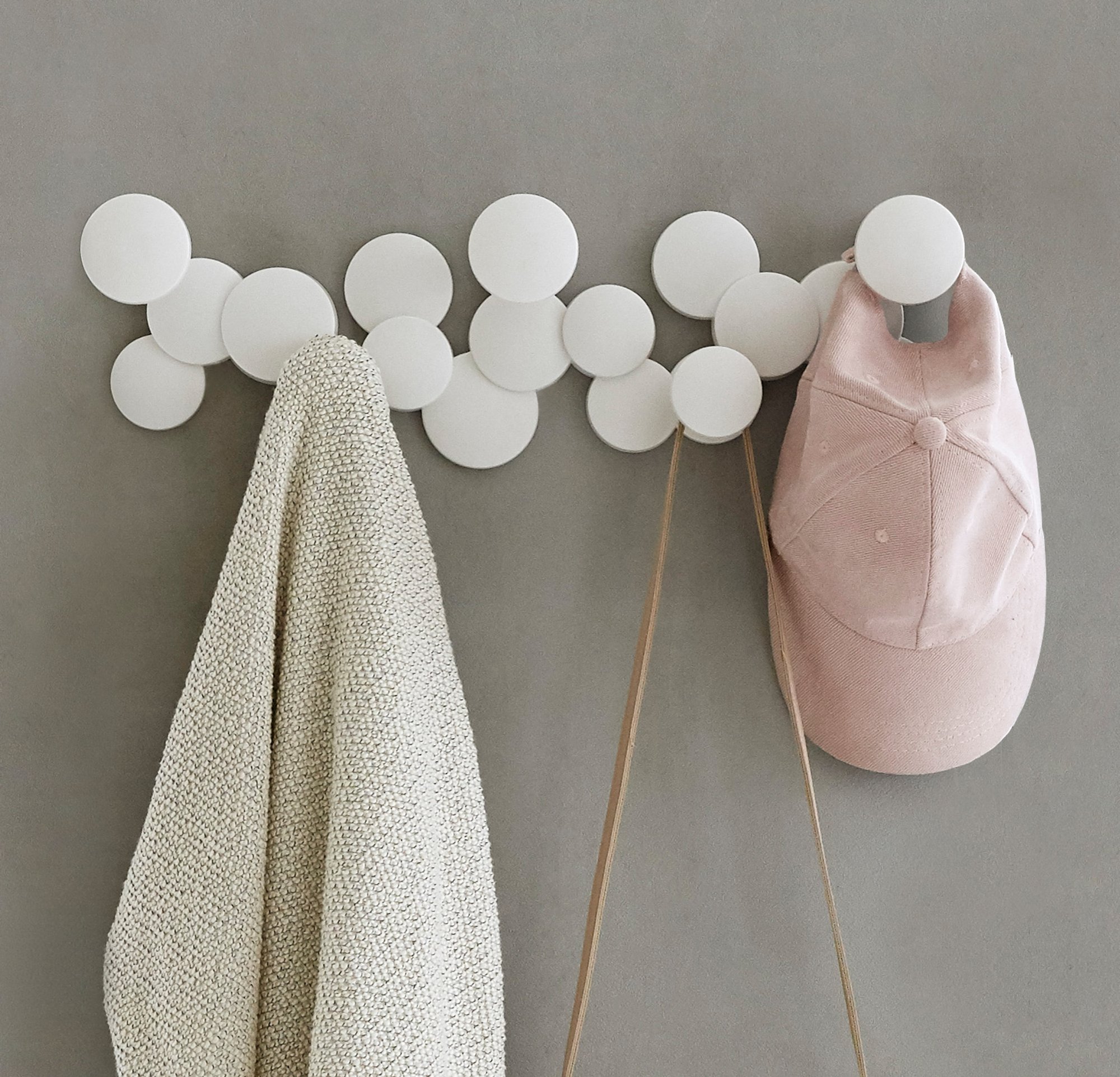 Bubble Hook es un gancho moderno y muy decorativo de Umbra. Tiene una forma lúdica que parece un grupo de burbujas y tiene un acabado suave y satinado. Cinco de las formas de burbujas sobresalen ligeramente para formar ganchos individuales y tienen una forma redondeada que evita que la ropa se enganche. Cuando Bubble Hook no tiene nada colgando, sus "Burbujas" se mezclan con el resto del gancho, lo que ayuda a que luzca más perfecta y como una obra de arte.