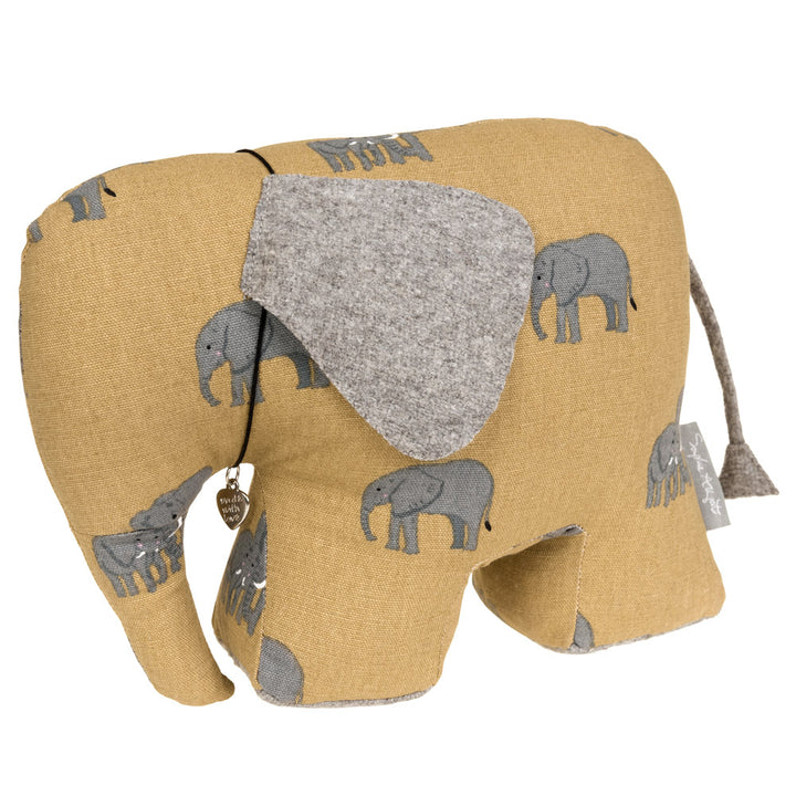 Dimensiones: 23 cm (alto) x 32 cm (largo) x 9 cm (ancho) Aproximadamente 1,5 kg La tela exterior es 100% algodón. orejas grises de fieltro Limpiar solo con esponja Relleno de gravilla y guata de tela reciclada Parte de la colección Elefante Todos los productos están hechos de rollos de tela con un diseño de patrón repetido. Esto significa que el diseño presentado en cada artículo variará.