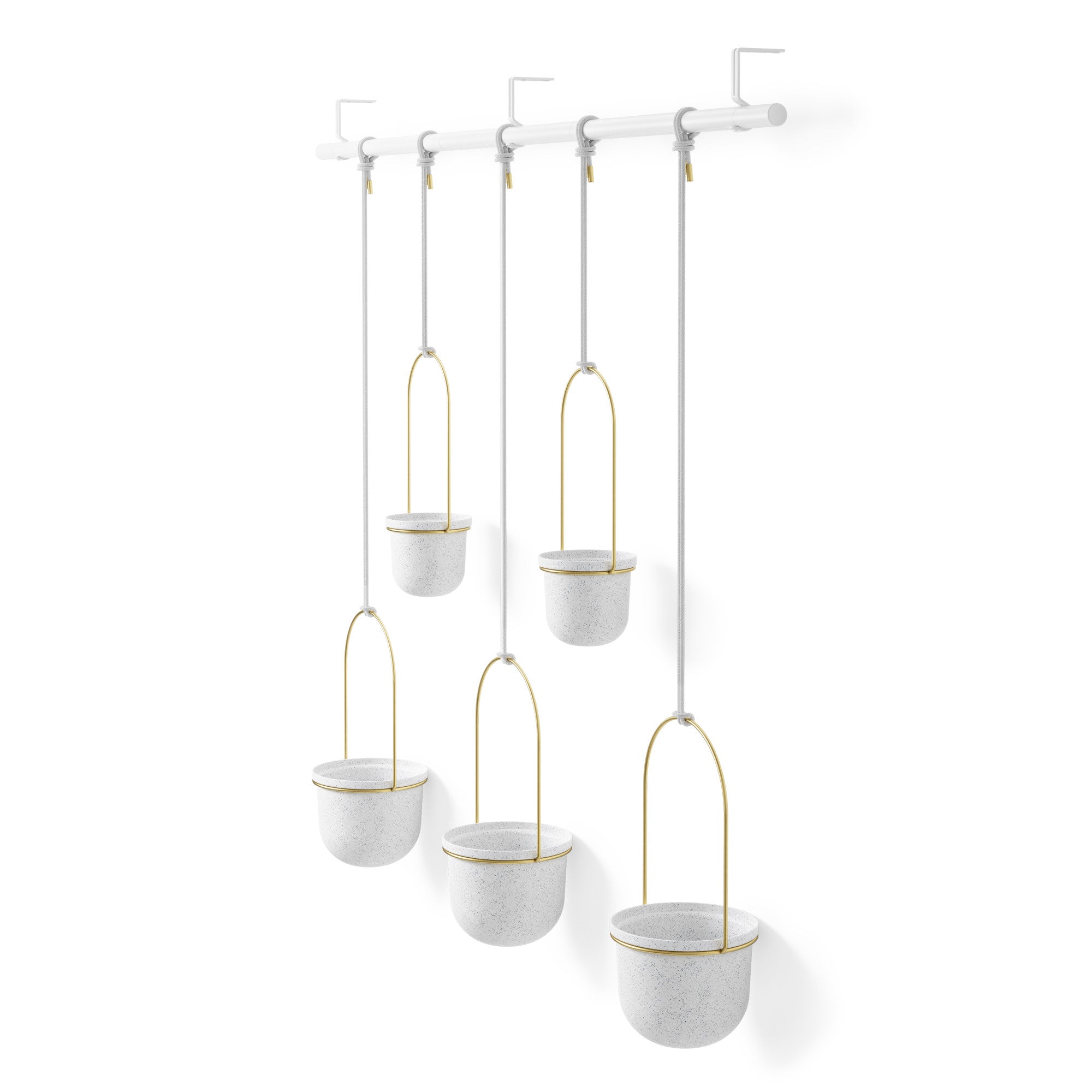 La maceta colgante Triflora se monta en la pared o el techo y agrega funcionalidad a la ventana al convertirla en un espacio para el cultivo de plantas. Puede ajustar la longitud de las cuerdas de Triflora y deslizarlas en cualquier lugar a lo largo de la barra de metal para personalizar la posición de cada maceta colgante. Las duraderas macetas de polipropileno reciclado pueden albergar dos macetas estándar de 7,6 cm (3 pulgadas) de diámetro y tres macetas de 15 cm (6 pulgadas) (por lo que no es necesario cambiar las macetas). Capacidad máxima de peso de 20 libras. (9,1 kg). Triflora también se puede utilizar al aire libre.
