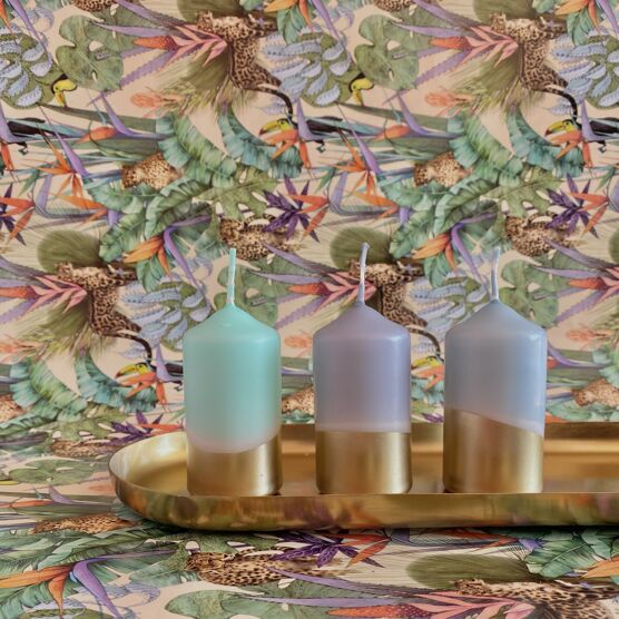 Juego de tres velas de pilar coloreadas a mano con cariño. Los delicados matices otoñales de la parte superior de la vela se complementan con un fresco tono dorado. Debido al trabajo manual, cada vela es única con una ligera variación en los degradados de color.