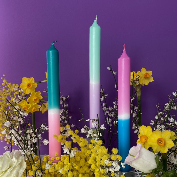 Juego de tres velas en forma de palo coloreadas a mano con mucho cariño y con aspecto de neón. Los colores siguen siendo los mismos, los degradados del patrón varían para cada vela, lo que las hace particularmente únicas.