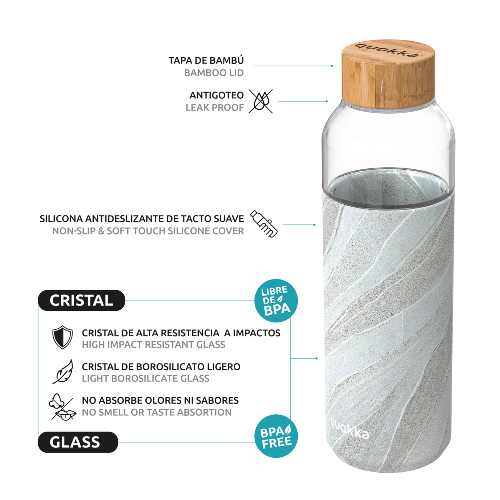 Nuestras botellas de cristal son ligeras y de alta resistencia a impactos. Para una mayor comodidad y protección, llevan incorporada una funda de silicona antideslizante que envuelve toda la superficie de posibles golpes y roturas. ¡Perfecta para los más precavidos!