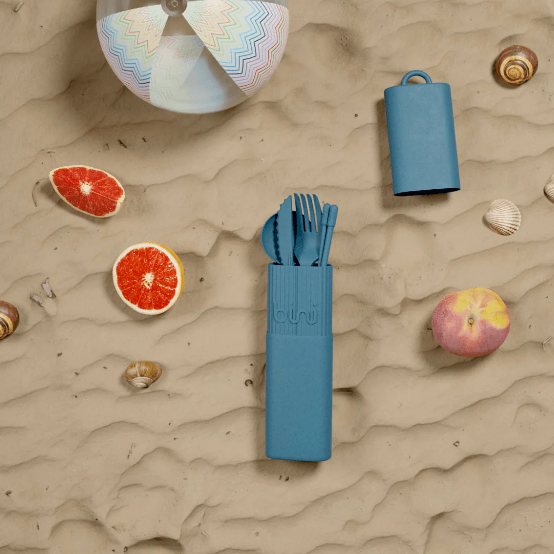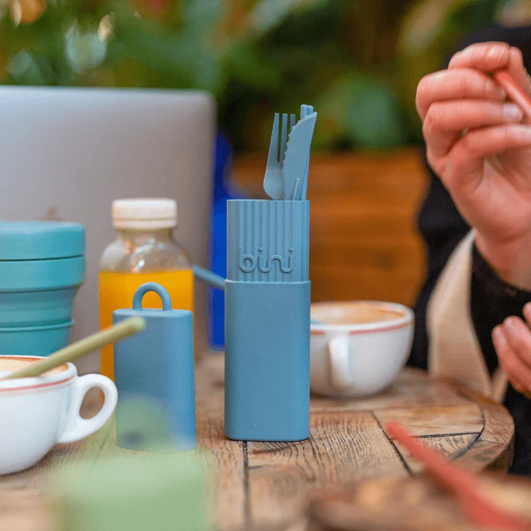 En el kit de cubiertos reutilizables Bini hay un tenedor que pica mucho, un cuchillo que corta a la perfección, palillos que agarran bien, una cuchara hueca para bonitas cucharadas, en un estuche pequeño, ligero, nómada e ingenioso.