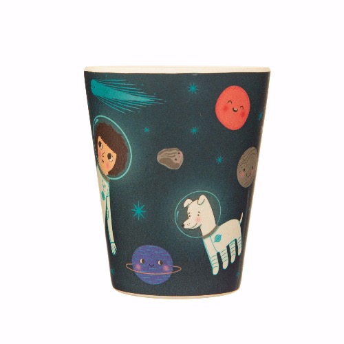 Este juego de vajilla de bambú incluye un plato de bambú, un tazón, una taza y una cubertería y presenta colores de explosiones de neón que colisionan con un azul medianoche.