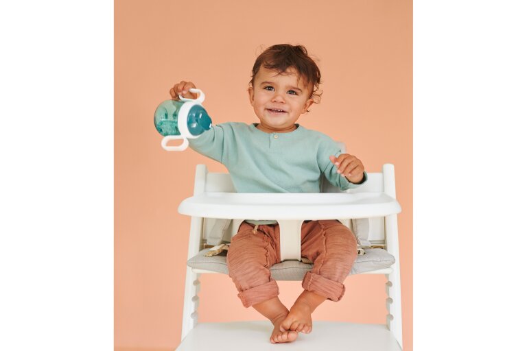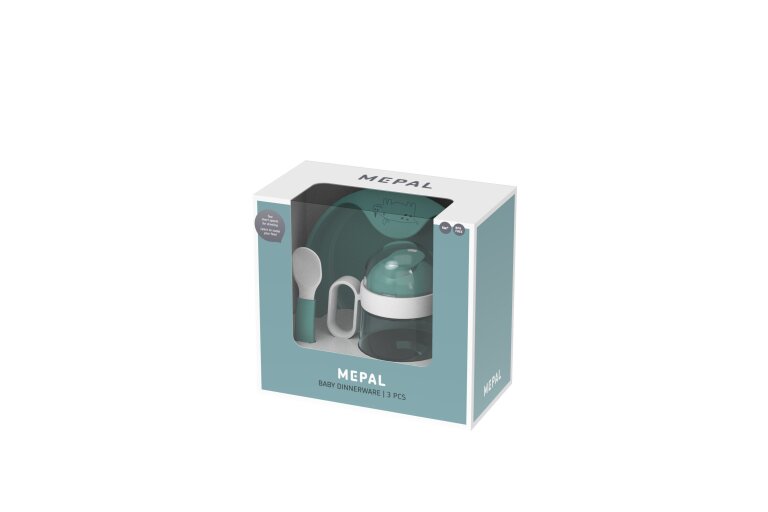 Vajilla para bebé de 3 piezas Mio. El juego consta de una taza antifugas, una tabla de ejercicios y una cuchara de ejercicios.