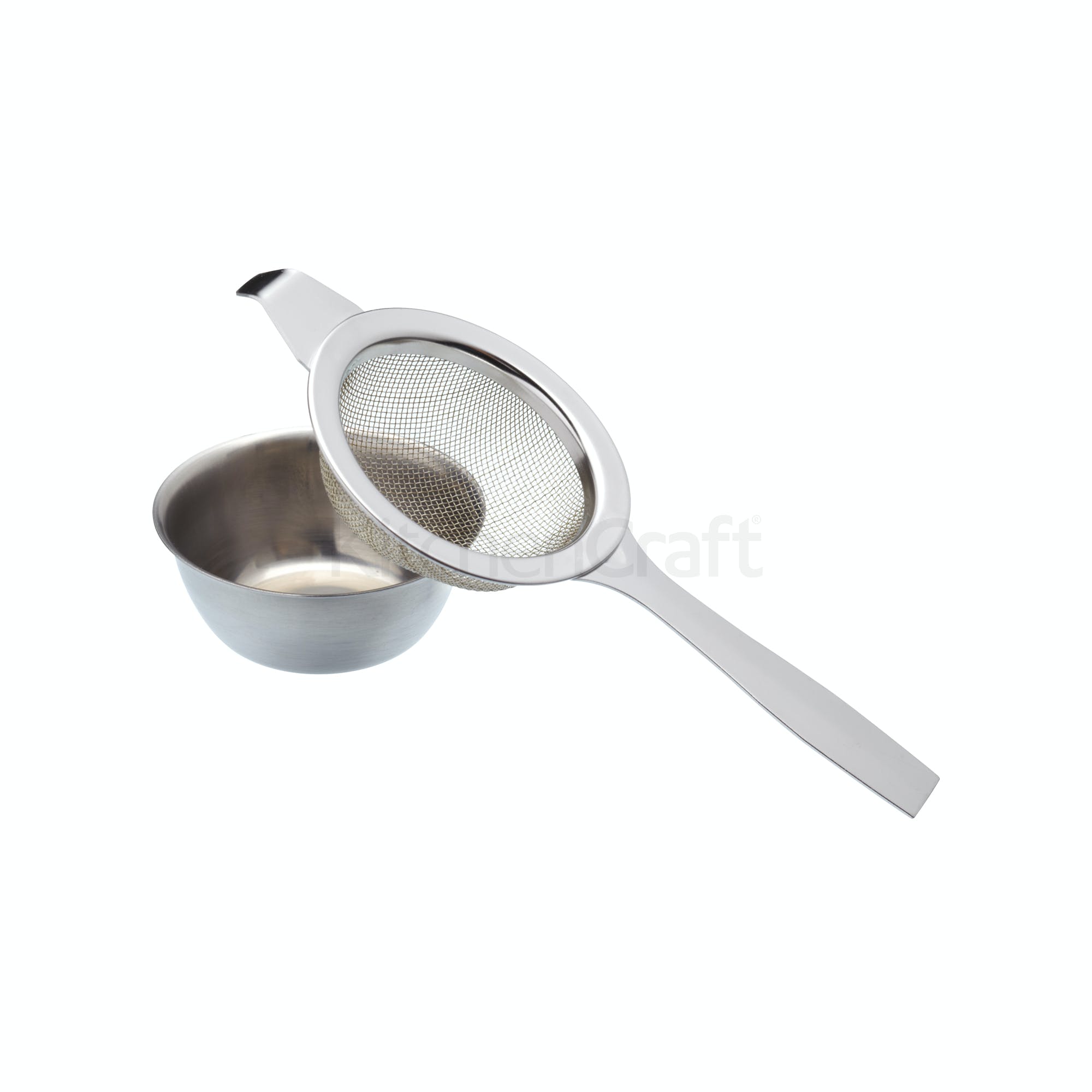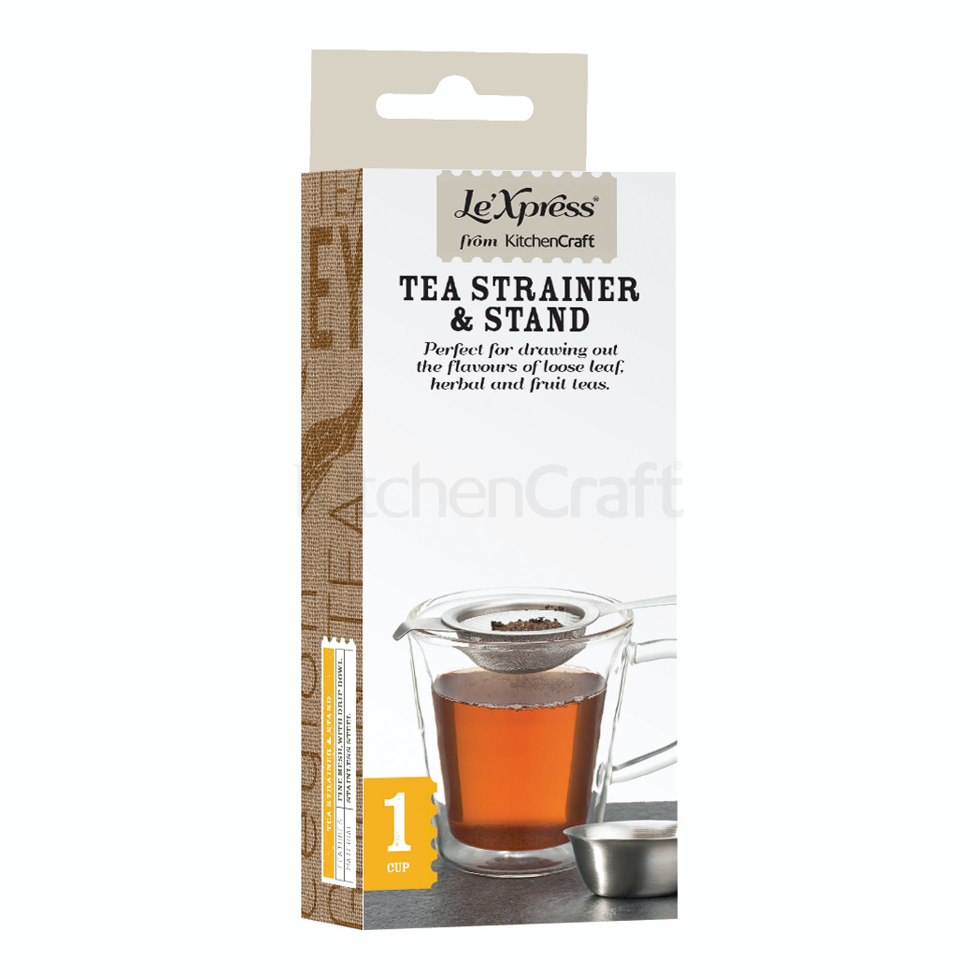 Colador de té de acero inoxidable con una gasa de malla fina, gancho de descanso integral y asa plana para descansar de forma segura en tazas y bordes de tazas. Completo con un práctico recipiente de goteo para colocar el colador después de su uso, capturando todos los goteos y derrames.
