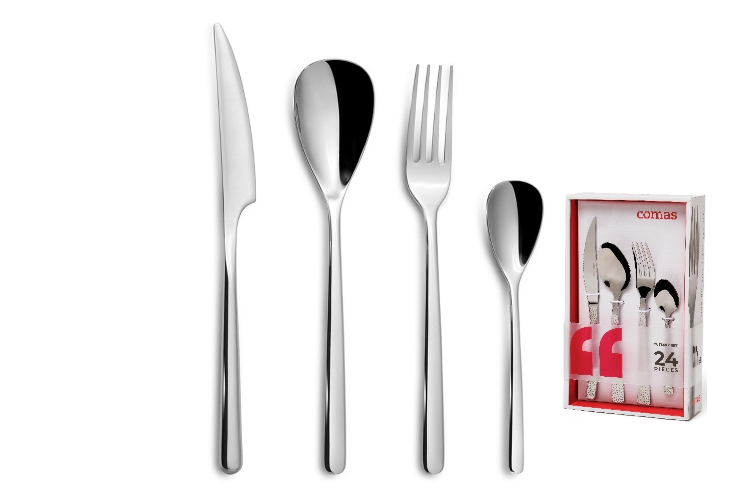 Compuesto por 24 piezas: 6 cuchillos de mesa, 6 cucharas de mesa, 6 tenedores de mesa y 6 cucharas de café.