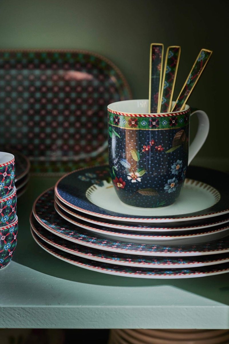 Esta taza forma parte de nuestra colección Berry Blues. Los colores azul oscuro y verde oscuro le confieren un aspecto cálido y elegante. Está decorada con un diseño floral azul oscuro con ramas de elegantes flores y bayas de fantasía. Los bordes están rematados con detalles dorados y una sorprendente franja roja y blanca, lo que le da a la taza pequeña Berry Blues un aspecto especialmente cálido y acogedor.