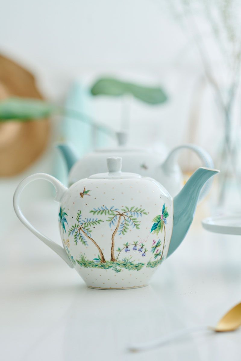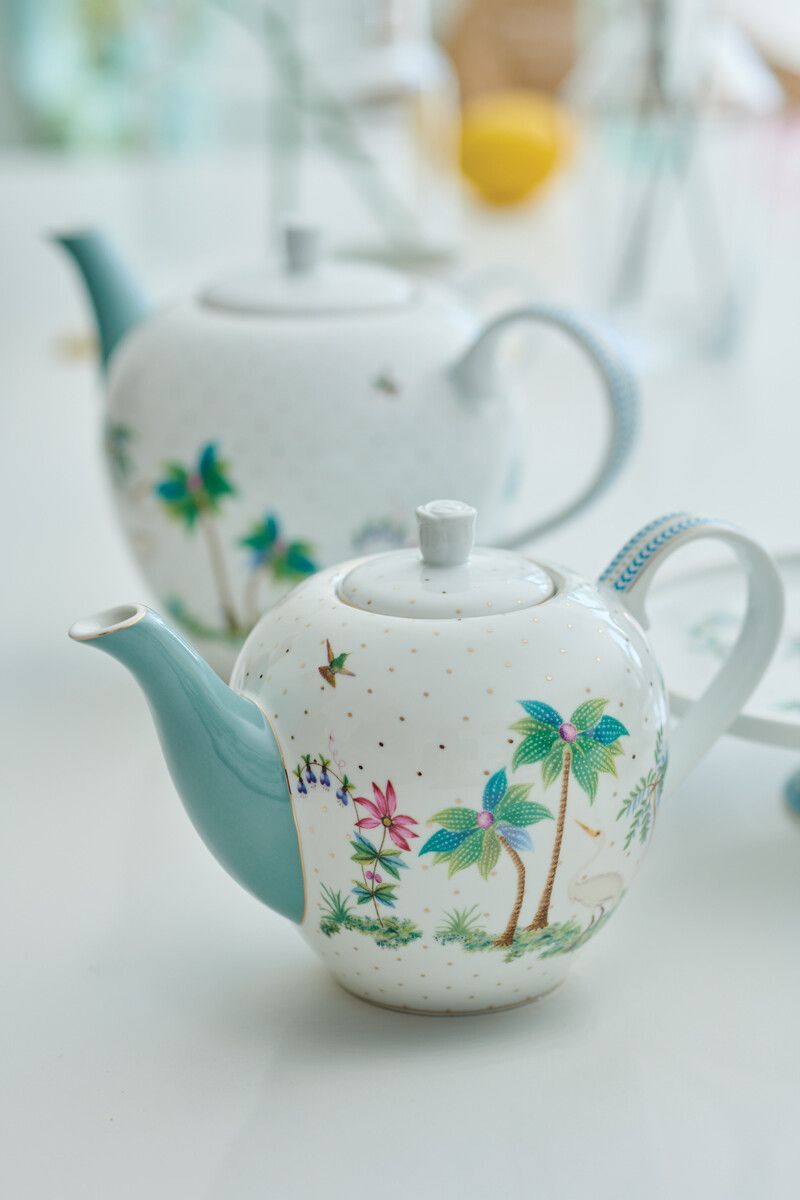 Esta pequeña tetera tropical con fondo blanco te llevará de viaje a una isla preciada. La tetera está decorada con plantas y flores tropicales únicas. Como palmeras y diversas frutas frescas de colores. Además, descubrirá una garza exótica combinada con hermosas flores prensadas y puntos dorados. El pico tiene un color azul cielo que se adapta perfectamente a las vibraciones tropicales. Combina esta tetera con otros artículos de la colección Jolie para obtener un resultado sorprendente.