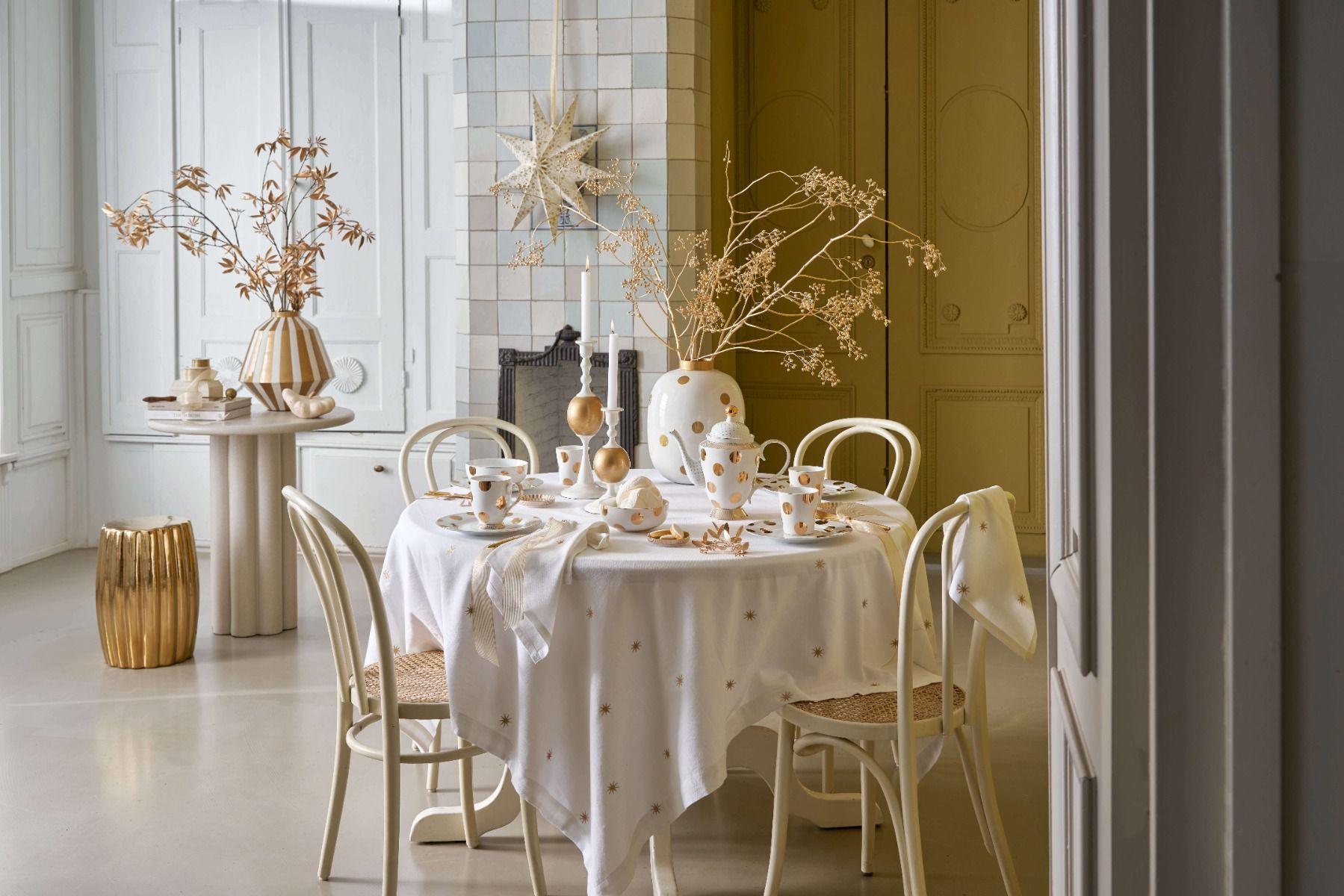 Completa la decoración de tu mesa con el hermoso mantel Dot Delight, un complemento festivo para la vajilla Royal Winter White. La impecable tela de algodón y lino blanca y el bordado de estrellas en hilo dorado crean un contraste perfecto con los puntos dorados redondos de la vajilla. Nuestros manteles Dot Delight añaden un toque de elegancia y festividad a cualquier comida, convirtiéndolos en la opción perfecta para ocasiones especiales.